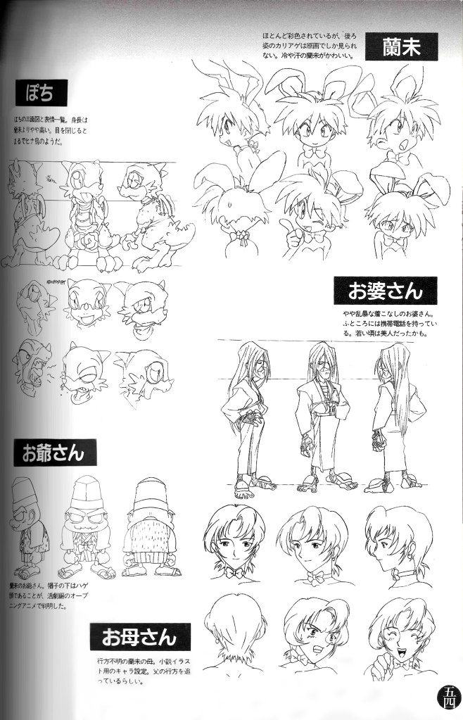 Settei/model sheets of the Nanahikari family (Rami Nanahikari, Spot Nanahikari, Grandma, Grandma, and Reira Nanahikari). Image © JVC Musical Industries/Victor Entertainment/SoftBank.