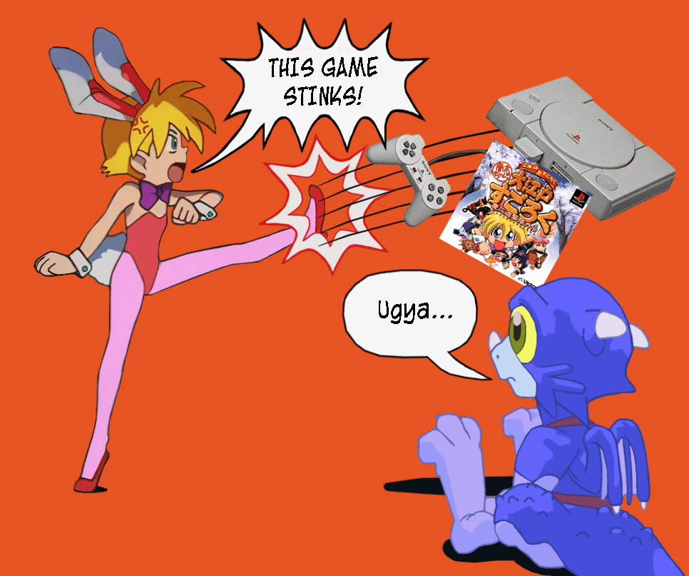 In PS1 Kick! (17 September 2024), Rami Nanahikari kicks away a copy of Rami-chan no Ōedo Sugoroku: Keiō Yūgekitai Gaiden and a Sony PlayStation in a fit of rage, not wanting to experience the game’s low budget, polygon graphics, boring gameplay, lack of Miho Kanno (her voice actress), and her treasure loss at the end. Image © mysuperendeavour@WordPress. Rami Nanahikari and Spot Nanahikari © JVC Musical Industries/Victor Entertainment. Sony PlayStation © Sony Interactive Entertainment.