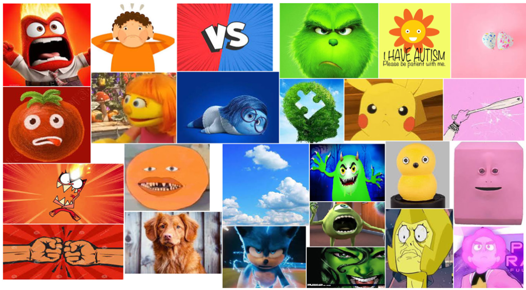Moodboard of colour images representing autism. Images © The Walt Disney Company/Pixar Animation Studios/Cartoon Network/The Jim Henson Company/Xploshi/SEGA Corporation/Paramount Pictures/Dr. Suess/Universal Pictures/Illumination/Marvel Comics/The Pokémon Company/Nintendo Company, Limited/Game Freak/Creatures/TV Tokyo/ShoPro/JR Kikaku.