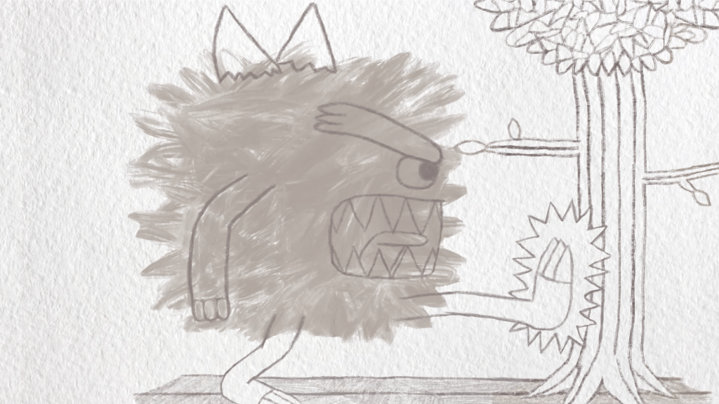Greg draws a monster kicking a tree to express his anger over the closed flower shop. Image © Oliver Mariager.