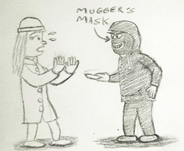 Greg gathering the courage to stand up to the mugger and take his knife away.