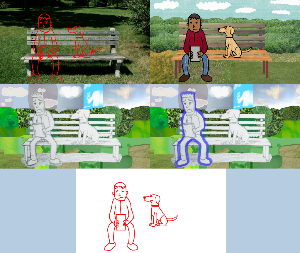I took photographs in a park in Ramsgate and used them as background, experimenting with them to represent the contrast between Greg’s world and the outside world. Adobe Stock images were also used as backgrounds for the park the flower shop and Greg’s house, with some being used as props in the latter. I watched other films for inspiration. Feeling My Way by Jonathan Hodgson had scenes with coloured outlines around rubbish bins and a square order around a man sitting in a laundromat, which inspired me to give Greg is blue outline to represent his nervousness, sadness, loneliness, restrictiveness and separation from his surroundings. Scenes from Mary and Max in which Mx wants logic and order I his life were used as inspiration for Greg pushing down a crease on his trouser leg at the beginning, and his reactions to the misplaced tub of soya spread in one of his sketches and the closed flower shop. His internal struggles to communicate were based on Louis’ nervous introduction in Louis’ Shoes. I took inspiration from Lambert the Sheepish Lion for Greg’s ex-girlfriend’s criticism of his inability to face conflict, and his initial cautiousness and bravery when standing up to the mugger. The knot forming over Greg’s stomach when he struggles to communicate with the woman was inspired by a scene in Utopia Portals by Jessica Ashman.
