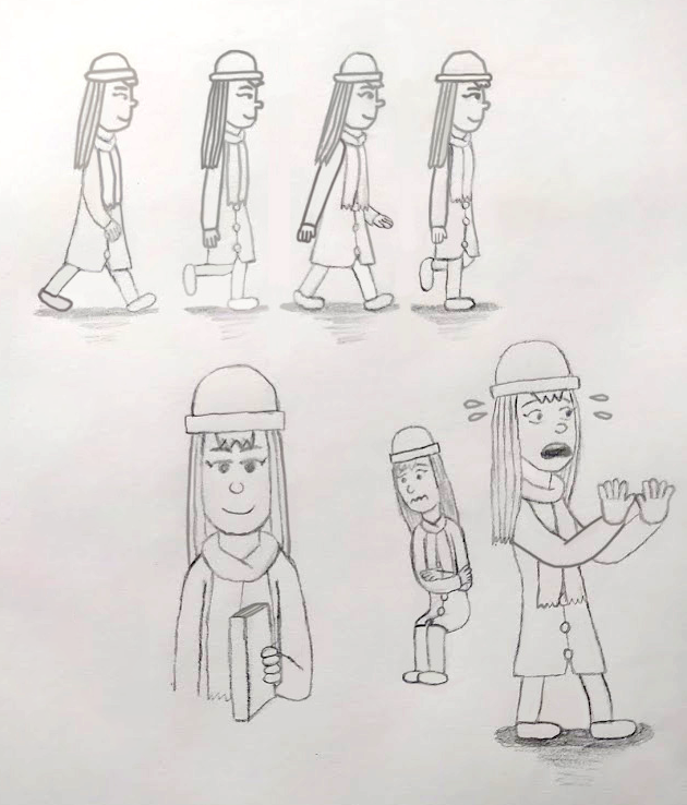 Model sheet, sketches and walk cycle for the woman. Image © Oliver Mariager.