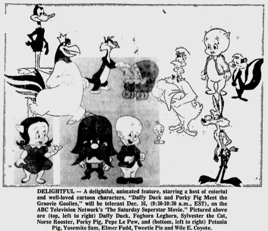 In mid-January 1972, Warner Brothers announced an expansion on the agreement, with 10 animated feature films, each budgeted at $1 million and set at 90 minutes and announced as a co-production. The three-year project was noted in the trades as being the largest deal of its kind in animation history. The tagline for the series of films was Family Classics, with Warner Brothers holding network and syndication rights. Titles announced were: Treasure Island, Oliver Twist, Cyrano De Bergerac, Swiss Family Robinson, Don Quixote, From the Earth to the Moon, Robin Hood, Noah’s Ark, Knights of the Round Table, Arabian Nights, and Jack London’s Call of the Wild. All of the works were based on books or concepts in the public domain, but not animated by any other studio. Warner Brothers was owned at that point by Kinney National Company, and with Filmation owned by the TelePrompTer Corporation, the cable market was being closely eyed for these films as a continual revenue stream. This meant that Filmation could employ an animation team of 400 people year-round.[5] On December 16, 1972, Daffy Duck and Porky Pig Meet the Groovie Goolies was aired at 9:30 as an episode of the anthology series The ABC Saturday Superstar Movie.[6][7][8]