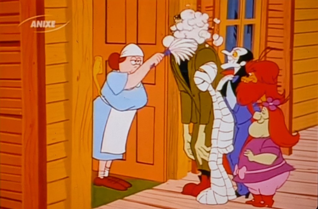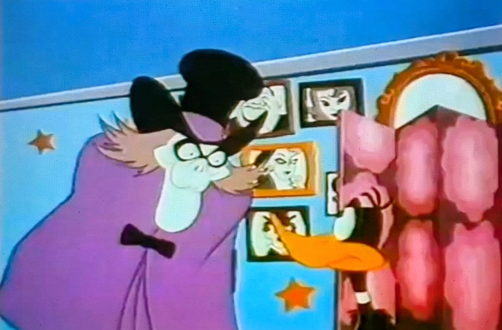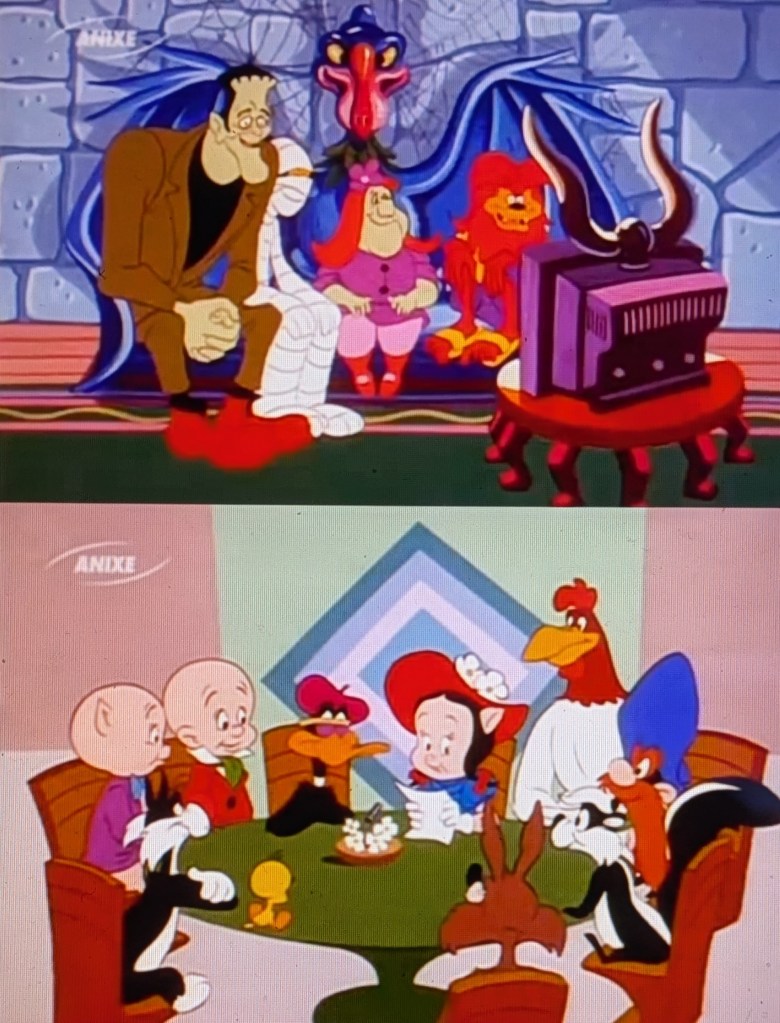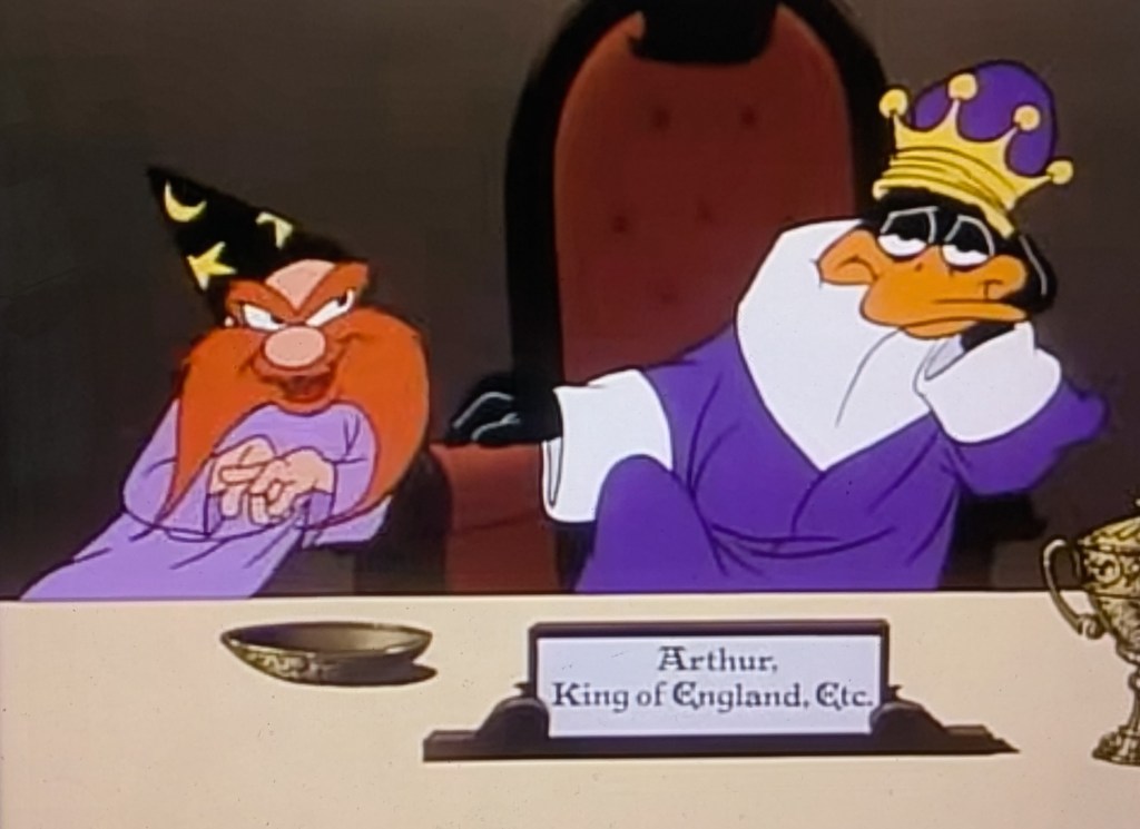 The plot begins at Horrible Hall, where Drac, Frankie, Wolfie, Mummy and Agatha are watching a television interview. In it, Daffy Duck is in Hollywood talking with reporter Petunia Pig about his new film about King Arthur and the Knights of the Round Table, starring himself; also appearing in it are Porky Pig, Petunia, Sylvester the Cat, Tweety Bird, Wile E. Coyote, Pepé Le Pew, Foghorn Leghorn, and Charlie Dog. Petunia also mentions a rumour about a mysterious stranger that has been causing all kinds of trouble on the set, to which Daffy think that it is a fan seeking an autograph. They then show a few scenes from the film: Foghorn, as “King Uther the Chickenhearted”, paces back and forth, until the nurse brings him his new children, a crate full of eggs. One of the eggs, however, is coloured purple. The king calls for the court jester, played by Sylvester. The court jester is awakened by a guard, played by Charlie, and asks the king what he wants to see. He proceeds to try to entertain him by slipping on a banana peel and pole vaulting out the window into a monster-infested moat. The king simply tells him to take the egg for a long walk. The court jester does so, taking the egg out in a baby carriage, and decides to cook and eat it. Tweety watches and stops the court jester from eating the egg, claiming that it might be one of his cousins, then threatens to blow a whistle to call bulldogs. The court jester repeatedly calls the bluff, until he notices seven dogs surrounding him. They chase him off, and the egg hatches, with Arthur (played by Daffy, fully grown but wearing a baby bonnet) emerging from it, and declaring that he is only 3 and a half years old. Taking the role of Ector, Tweety names him “Arthur”, to which Arthur objects, asking Tweety why he can’t call him “Lance”, “Rock” or “Daffy”. The canary tearfully laments that his mother’s name was Arthur. Suddenly, the program is interrupted by a ghoulish being named the Phantom of the Flickers, who announces his intention to destroy every film that Daffy Duck and his studio ever made, including their current King Arthur film. Hagatha can’t help noticing how familiar the Phantom looks, while Frankie, being a huge fan of Daffy, goes to Hollywood to offer his help. The other Horrible Hall residents go along with him, with Mummy bringing his camera.