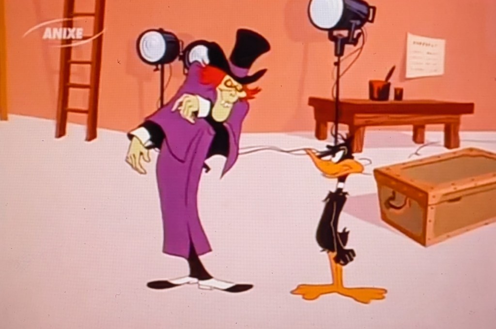 On a filming of a Western showdown between a marshal and a bandit, Frankie pops out of a manhole, tossing one of the actors, Lance, onto the ground and making him throw a tantrum. They see the Phantom running into a house set. When Frankie rings the doorbell, the Phantom appears, disguised as a maid, and tickles them with a feather duster, creating a giant cloud of dust that covers the Goolies, making them sneeze. He then changes into a gardener and sprays them with water from a hose, before changing into the “head of the house” (his head is a house), and slamming the door on them. Then the whole prop falls over on the Goolies. They hear the Phantom laugh and chase him into a little shed. Sam, Porky and Wile E. watch them from a bush, thinking that the shed is their hideout. Upon entering the shed, the posse find themselves standing in a large, fancy room. They split up, and right after they leave, the Goolies come out from a wall panel. Hagatha uses her crystal ball to find the Phantom, only for him to freeze it. Frankie worries about Daffy and suggests going to check up on him.