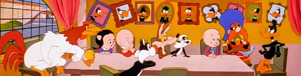 Daffy, Sam, Porky, Pepé, Wile E., Sylvester, Elmer, Petunia, Tweety and Foghorn all sit at a conference table. Daffy tells them that the Phantom and the Goolies are trying to stop the production of King Arthur, which has to be finished in time for the annual Ozzie Awards tomorrow night. When he described them to the police, they said that he was insane and hung up. Sam suggests organizing a posse to capture them, unaware that the Phantom is listening to them from outside. Everyone is reluctant, to which Daffy asks them if they are chicken. Foghorn resents that. Sam asks Sylvester if he would like to join the posse, but Sylvester refuses and runs off. Wile E. holds up a sign saying, “I’ll go”, and Porky agrees to go.