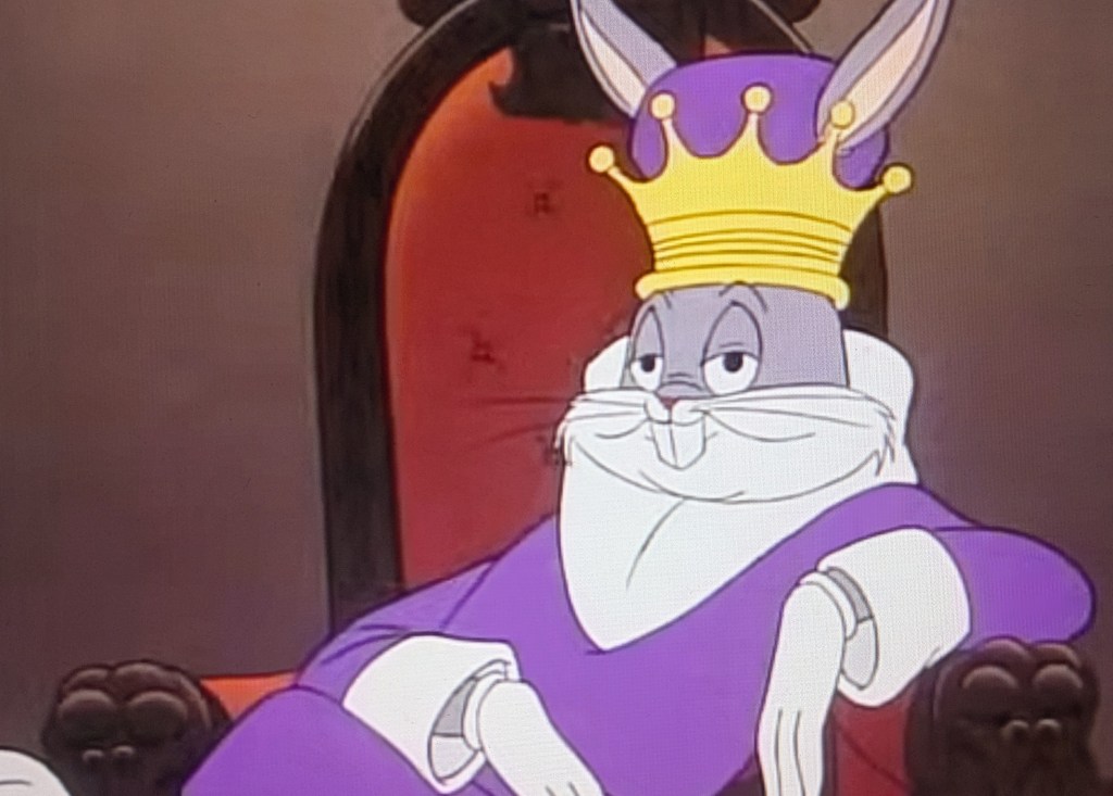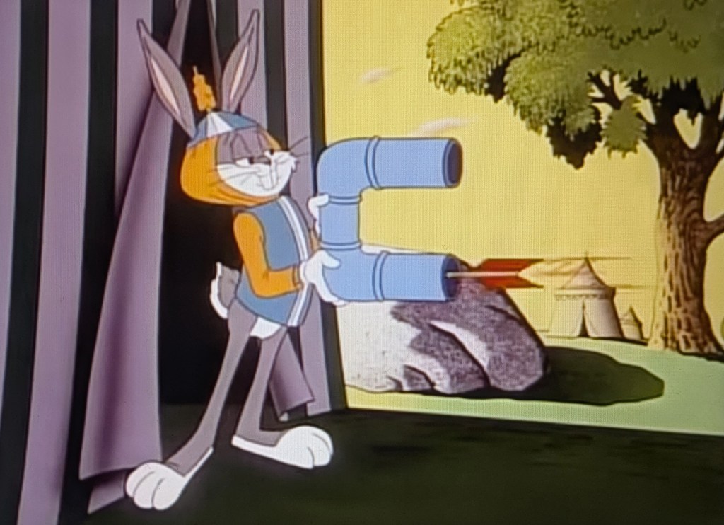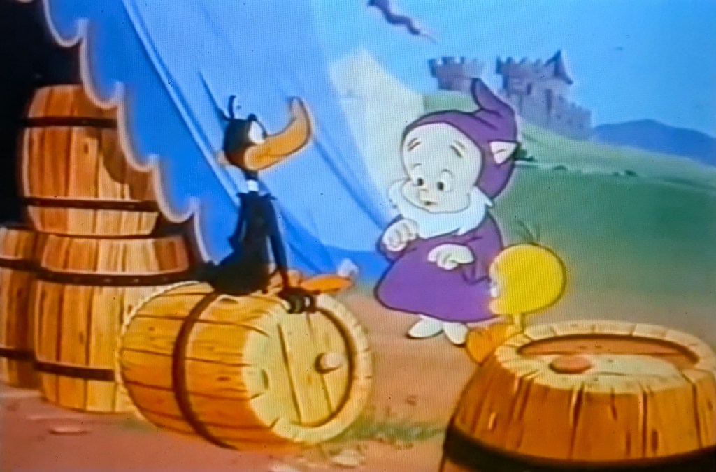 Two years later in 528, Bugs takes Sir Loin of Pork/Porkè of Pigge, the Varlet (played by Porky Pig), on a tour in his ACME Armour Factory, showing him inventions to reform medieval society, such as horsepower, dragon power, steam power, electric power, and armour created for endangered species like foxes, squirrels (not shown), deer, moose, elk, antelope, Tweety Birds, mice, cats, dogs, flies, roosters, rattlesnakes and porcupines. However, Elmer stab’s Bugs’ dragon with his lance, making him run away, yelping in pain. Bugs confronts Elmer, who still thinks that the latter is a transformed dragon. He takes off his glove and smacks the rabbit in the face, before challenging him to a duel, to which Bugs then punches Elmer’s face with a boxing glove. During the duel, Bugs uses his extremely long lance to pole vault over Elmer, douses him and Merlin (who has allied with the knight) in the moat, steals his armour using a magnet, and sends Elmer’s arrow and catapulted rock at them using a U-shaped pipe and spring, respectively, much to King Arthur’s amusement. Merlin skids out of a tent to light a cannon to kill Bugs, but Bugs tells him that he can’t use a cannon because gunpowder has not been invented yet. The magician takes a look inside and is blasted, cursing Bugs and calling him a “goldang coniglio lapin dragon” and “rampin’ frampin’ coneho lizard”. Bugs then finds what he thinks is a “neat carrot slicer” in a stone, unaware that Elmer and Merlin are pushing a wooden ax-wielding vehicle toward him. He innocently pulls the “carrot slicer” out of the stone, which is revealed to be Excalibur when a disembodied voice (God) proclaims him as the new king. Elmer and Merlin stop in their tracks as God says that anyone who does not like Bugs being the king will be boiled in baby oil. Porkè, Elmer and Merlin pledge their allegiance to him, and Daffy abdicates and relinquishes the crown to Bugs, the new ruler in “King Arth-Hare’s Court”.