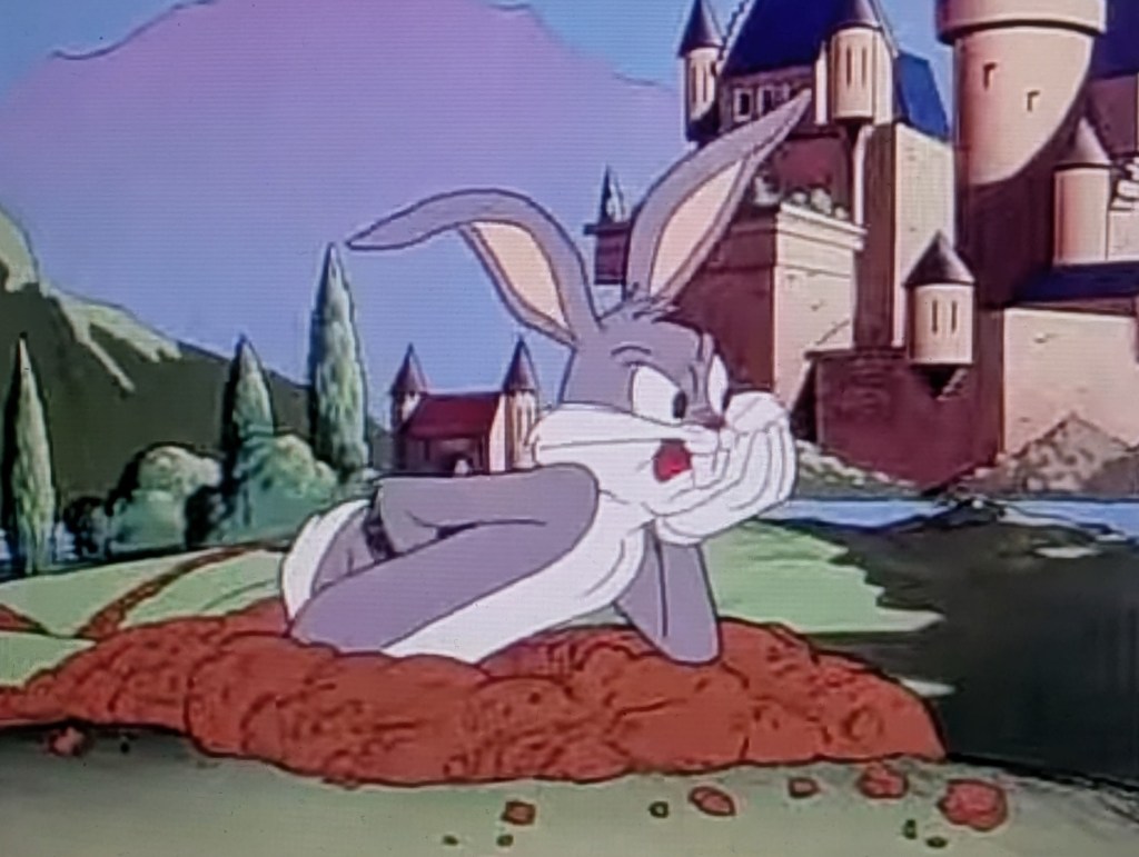 Bugs Bunny is trying to reach a peanut festival in Georgia, but thanks to faulty directions from Ray Bradbury, he takes a wrong turn at Albuquerque and time-travels to Camelot in the year 526. He mistakes Cmelot for Pittsburgh at first, but meets a fire-breathing dragon. After hiding in his hole to avoid the beast, Bugs mentions having previously time-traveled to 25th-century Mars thanks to Bradbury. Just then, his carrot is speared by Sir Elmer of Fudde (played by Elmer Fudd), a brave knight. Elmer tells him that he has been hunting for a dragon, and mistakes him for a transformed dragon. He captures Bugs, tells him that he is in Camelot after the latter sings “Barbara Allen”, and takes him to the castle of King Arthur. There Bugs is presented to the disinterested Arthur, King of England, Et Cetera (played by Daffy Duck), and bloodthirsty court magician Yosemite Sam as Merlin of Monroe, Baron of Yosemite (played by Yosemite Sam). Elmer tells everyone about his dragon-hunting skills and capture of Bugs, who calls him a “fibber”. Merlin wants Bugs drawn and quartered; when the rabbit begins talking about being in animated cartoons for years and not being born/literally drawn until 1940 and private quarters with nice views and baths, he tells him to shut up. This makes Bugs shed some tears, and Merlin seems to regret hurting his feelings at first, but then angrily yells for him to be burned at the stake. Bugs uses a solar eclipse to fool the locals into thinking that he can affect the sun’s movements. In spite of Merlin wanting him to be burned and much to Elmer’s chagrin, he is released, and Arthur grants him custody of an actual fire-breathing dragon.