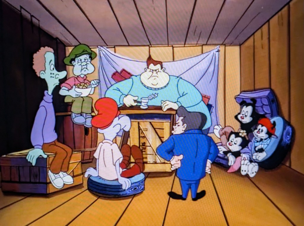 Plotz loses a costly gamble on another film starring Chicken Boo. Desperate for cash, Plotz has the Warners guest star on an episode of Thunderdogg, which has been sinking in ratings. They change up the show by stealing Thunderdogg’s magic feather and laminating it using the Gammalaminator, leaving him crushed by a heavy weight with a flattened lower body and legs after the show, while Sweet Polly Dognose is dropped into a tank of seawater and fed to a hungry seal by Simon Sam Simeon. After that, the Warners are loaned out to Phlegmation. Plegmation supervisor Lem Botchitt explains that they never did cartoons like the Warners usually did, and that the Warners fouled up that studio’s stock animation system something awful. The Warners find themselves in a “vast video wasteland” in an episode of Obese Orson, where they meet a morbidly obese boy named Orson, who says that he is going to chant a message to them. They prevent him from doing so, with Dot saying that they have suffered enough on Saturday mornings, and Wakko saying that they want to have fun. Orson takes them to a clubhouse, where he organizes a meeting with his friends: Gerald, Hooknose Harold (who chokes on his nose), Muttermouth and Todd A-O (who is in the show because of his funny name). Upon hearing that the Warners want to have fun, Muttermouth and Gerald reveal that they do not have fun. Instead, they prefer to preach pro-social values until they spew out of everyone’s ears and all over the ground. Orson bans the Warners from their territory, much to their delight. They bring in fun by rapidly kissing all the characters, who can’t move because of their limited animation. By this time, Warner Brothers eventually regains their profits, but Plotz neglects to inform the Warners about this, continuing to loan them out to other cartoons such as The Tro**kes. When the Warners learn of this, they return to the studio and beg Plotz to stop loaning them out. The CEO then explains that he intends to use the studio’s renewed profits to produce a follow-up film called Shamboo. Realizing that this is the same actor that starred in the box-office bomb Young Blood Squawk, the Warners destroy their loan-out contract and return to the Water Tower, kicking Shamboo out. They demand to not be called again until they can have their own network. As they play a game of cards, Yakko assures that they will be good for about 20 years.