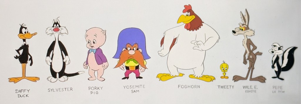 According to Lou Scheimer, Daffy Duck and Porky Pig Meet the Groovie Goolies was the strangest project for Filmation that came from their deal with Warner Brothers (which somewhat fits the Groovie Goolies’ description in Sabrina and the Groovie Goolies‘ theme song as “kind of strange” and “real funny”), who had shut down their animation department in 1969. They had the rights to use some of Warner Brothers’ characters, so they hired Groovie Goolies writers Chuck Menville and Len Janson to write the special’s story, in which the Groovie Goolies would go to Hollywood to meet the Looney Tunes characters. Janson had previously written the Road Runner cartoon Boulder Wham! in 1965. Filmation used a lot of the main Looney Tunes characters, except Bugs Bunny (who had not been seen since the closure of Warner Brothers’ animation department in 1964), Speedy Gonzales and the Road Runner. The cast seemed to roughly follow that of The Porky Pig Show‘s opening and closing sequences, animated by Hal Seeger and Myron Waldman at Paramount Cartoon Studios. In contrast to the DePatie-Freleng Enterprises, Format Films and Warner Brothers-Seven Arts cartoons from the 1960s, Daffy was not longer a bitter and greedy villain, instead being far more laid-back and in control, if still showing signs of egomania. This film marked the first time that the Looney Tunes characters would make a film together; the second and third times would be in Warner Brothers Movie World’s Looney Tunes River Ride 19 years later in 1991, and Warner Brothers Movie World Germany’s Looney Tunes Adventure 24 years later in 1996, both of which I wrote a blog post about in 2018. Veteran voice actor Mel Blanc provided the voices of Daffy Duck, Porky Pig, Elmer Fudd, Yosemite Sam, Tweety Bird, Sylvester the Cat, Foghorn Leghorn, Wile E. Coyote and Pepé Le Pew, though, they sounded a little different from the classic shorts; Filmation editors Doreen A. Dixon and Joseph Simon incorrectly pitched and sped up Blanc’s voice recordings for Daffy and Tweety higher and faster than normal, to the point that the former sounded a lot like his early “screwball” incarnation by Tex Avery and Bob Clampett or Woody Woodpecker, and forgot to speed up Porky’s voice. Elmer, Sylvester, Foghorn, Wile E. and Pepé’s voices sounded deeper than usual, due to Blanc not being thrilled about working on the special and not doing Elmer’s voice to his satisfaction (Elmer’s normal voice actor, Arthur Q. Bryan, died many years before). Sam was the only character who did not sound different from the classic shorts. Larry Storch reprised his roles as Drac and Hagatha and voiced the Phantom of the Flickers, while Howard Morris reprised his roles as Frankie, Wolfie, Mummy and Hauntleroy. The Phantom of the Flickers was a parody of the titular antagonist of Gaston Leroux’s The Phantom of the Opera, with the “Claude Chaney” derived from Lon Chaney, Senior (who played the title role in the 1925 film) and Claude Rains (who starred in the 1943 film).[9] Additional voices were provided by Scheimer (Director, Lance and Herald), his wife Jay Scheimer (Petunia Pig and Nurse, and probably Sylvester’s panting; Jane Webb’s pseudonym “Joanne Louise” is listed in the credits, yet Petunia and the Nurse sound nothing like Webb, indicating that Webb’s name was listed with her being considered for the roles, or a scratch track was recorded with Jay, and Webb came in to record the roles, but her track got lost or went unused and Jay’s track was used instead), Storch (Charlie Dog, Tweety’s whistling (Storch would voice Bugs Bunny in an ABC promotion the following year in 1973), Marshal Actor, Messenger, Singing Telegram Horse, Announcer and Joust Horses), and archive recordings of Hey Hey as Lassie (Dogs) from Lassie’s Rescue Rangers and Dallas McKennon as Salem Saberhagen (Sylvester’s meowing) from The Archie Comedy Show and Sabrina and the Groovie Goolies. Though the animation was limited as expected from Filmation, even in comparison to the Format Films and Warner Brothers-Seven Arts cartoons, most of the Warner Brothers characters were drawn well and animated to a somewhat higher standard than usual, having more movement and poses than the Groovie Goolies characters,[10][11] since veteran Warner Brothers animator Virgil Ross was working at Filmation at the time,[12][13][14][15][16][17][18][19][20][21] along with Ted Bonnicksen, LaVerne Harding and Ed Solomon, two of whom had worked for Warner Brothers in the late 1960s (only Ross and Harding were credited as animators at the end).[22][23] They even used smear frames and wheels of feet for the characters when running really fast,[14][24] as well as the horses in Daffy’s King Arthur film during the jousting match, and the picture frames during Daffy’s meeting used faces of Daffy lifted straight from a 1960s model sheet.[25] Despite this, Wile E. and Pepé were drawn scruffier than usual. Both characters were created by Chuck Jones, and since Ross was usually in Friz Freleng’s unit at Warner Brothers, he may have had problems drawing them in most shots.[17] He had previously animated Wile E. in 10 of Rudy Larriva’s Road Runner cartoons (Ross’ Wile E. looked somewhat decent in those shorts),[26] and would animate Pepé in Bugs Bunny’s Mad World of Television 10 years later in 1982.[27] Daffy also had a sort of deformed and off-model look at many times in the special, akin to the Warner Brothers-Seven Arts cartoons. Bonnicksen, Harding and Solomon worked on some of those shorts and a 1968 Plymouth Road Runner commercial, so it is likely that Harding (the only credited Warner Brothers-Seven Arts animator) handled a few of Daffy’s scenes where he was off-model, as well as some for Wile E. The special and a 1972 Bugs Bunny Vitamins commercial produced by DePatie-Freleng Enterprises marked Petunia Pig’s first “official” color appearances, since she never appeared in an