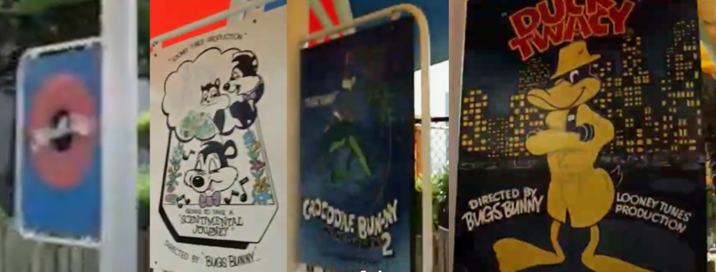 The ride began with guests queuing outside a white colourbond show building decorated as a film studio and labelled “STAGE 14”, standing next to film posters for Duck Twacy (a parody of Dick Tracy), Crocodile Bun-ny 2: In the Outback (a parody of Crocodile Dundee II) and Going to Take a Scentimental Journey and a “That’s all Folks!” poster. They would then be led into a room (with both well-known and lesser known Looney Tunes characters on its walls) where they were welcomed to Looney Tunes Studios in “Hollywood” by a cast member dressed as a tour guide from the Studios’ Public Relations Department holding a microphone. Guests were then informed that they would be taken on a tour of the studio where the latest Looney Tunes film, directed by Bugs Bunny (voiced by Greg Burson; compare to his takes in Macy’s Thanksgiving Day Parade, Tiny Toon Adventures and Animaniacs), was being shot. However, Bugs had thrown a temper tantrum and dug a hole into the centre of the Earth down to Australia, resulting in the film’s production ceasing.[4] The guests would then walk into the reception area, labelled “SOUND STAGES”, where the guide would show them the doors to the Public Relations Department, Sound Stage 4 and Sound Stage 1, and a light that indicated the production status, and also saw Bugs outside a window holding a window blind labelled “BUGS SAYS… NO FLASH PHOTOGRAPHY”.[5][6] Since production had been stopped, the guests would proceed through a door to the next room (Sound Stages 2 and 3), which was filled with goofy and creepy but lovable and amazing animatronic Looney Tunes characters.[7]Foghorn Leghorn (voiced by Greg Burson; compare to his takes in Tiny Toon Adventures, Animaniacs and Looney Tunes: Reality Check) was standing under a studio light and next to a wooden house. The Tasmanian Devil (voiced by archive recordings of Mel Blanc; these almost faint vocal effects were used in other consumer products at the time, like talking toys (such as the Spin and Snarl Tasmanian Devil Plush) and watches, as well as in this Mil-Looney-Um 2000 promotion, and were likely supplied by his son Noel Blanc to be used in the ride’s track; compare to Blanc’saged take in the 1970s and 1980s) was chewing on a piece of wood and was in a hole in the ground that was very close to the house, and was grunting, growling and rasping. Yosemite Sam (voiced by Greg Burson; compare to his take in Animaniacs), Pepé Le Pew (voiced by Greg Burson; compare to his take in Tiny Toon Adventures), who was wearing a red tuxedo, and Daffy Duck (voiced by Joe Alaskey; compare to his takes in Tiny Toon Adventures and Bugs Bunny’s Lunar Tunes) were standing on the front porch of the house (those animatronics were arranged in a manner similar to the animatronics in the Balcony Stages at Pizza Time Theatre). Speedy Gonzales (voiced by Joe Alaskey; compare to his take in Tiny Toon Adventures and his Henery Hawk) was sitting on the roof of the house. Porky Pig (voiced by Bob Bergen; compare to his take in Tiny Toon Adventures), ElmerFudd (voiced by Greg Burson, compare to his takes in Tiny Toon Adventures and this Weetabix commercial), whose hat and rifle were lying on the ground nearby, and Wile E. Coyote were looking down the hole in the ground that Bugs had dug through the middle of the Earth to Australia. Sylvester the Cat (voiced by Joe Alaskey; compare to his take in Tiny Toon Adventures) and Sylvester Junior were licking their lips, rubbing their stomachs, and looking up at Tweety Bird (voiced by Bob Bergen; compare to his take (0:06, 0:42) in Tiny Toon Adventures), who was balancing on the branch of a cardboard tree prop, which Marc Antony (voiced by Noel Blanc; considering that Noel provided archive recordings of Mel as Taz for use in the ride’s track, it is likely that he did Marc Antony’s snoring as well; it does not sound like Greg Burson, Joe Alaskey or Bob Bergen) was sleeping against. The tour guide would say, “As you already know this picture is overscheduled, and way overbudget. Do you guys realize how much this delay is costing the company? Well, do you? Where’s the director? Where’s the star? Where is Bugs Bunny? Have you seen him?” After that the Road Runner (voiced by archive recordings of Paul Julian, taken from Zoom and Bored) would emerge from a hole in the roof of the house saying, “Beep, beep!”[5][6] The tour guide would say, “Well, first, it seems Bugs has stormed off the set, down that hole, and no one seems to know what is going on.” He or she would then ask Foghorn, “How are we gonna get him back? You have got to start all the way again, Foghorn. Where is he going?” or “Now Foghorn, for the last time, please explain to me exactly what happened.” A light would shine on Foghorn, after which his left arm would raise, and when it was around shoulder height he would begin to talk.[8][9] Foghorn would respond to the tour guide by telling him or her, “That darn… ah say, that darn rabbit got handed the directah[‘s chair]. Dug this heah hole, an’ he’s gone!”[8] It was up to the tour guide to keep up with the animatronics, as Elmer would say, “I’ww bet he’s heading fow Austwawia.”[9][8] The tour guide would say, “Australia?” Foghorn would say, “We got… ah say, we gotta trah an’ get him back!”[10] The tour guide would say, “That’s all very well, but how?” Foghorn would say, “Ah haven’t… ah say, ah haven’t decahded. We could follow him in the earth drill on Stage 2, or with the Tasmanian Devil heahs dahn this dark hole.” The tour guide would say, “I’m not putting my guests down that hole. I know, why don’t you guys follow Taz down the hole, and I’ll take our guests onto the next sound stage and into the earth drill? Now the earth drill’s an authentic working model from another movie, a space picture as you will see from the set. I’ll reprogram the computer as to allow us to follow Bugs Bunny r