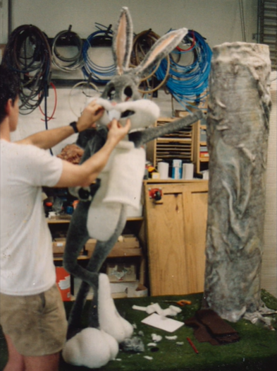 ‘The one animatronic designed by Heimo for Warner Brothers Movie World was a Bugs Bunny animatronic lying on his side and resting his head in his hand like a beachgoer and was installed high up, mostly out of sight, slightly before you reach the very basic koala characters in a tree. I can’t remember if we reprogrammed him with any lines. Will have to track back some old videos. I remember he did seemingly angrily shout repeating on a loop, “Heraus aufgeben, heraus aufgeben, ich bin der Fledermaus von Ralitek!”, which was particularly weird as I think “Fledermaus” means “bat”. I still have a video of the Heimo-designed character, but have not digitised or posted it online yet.’[35]