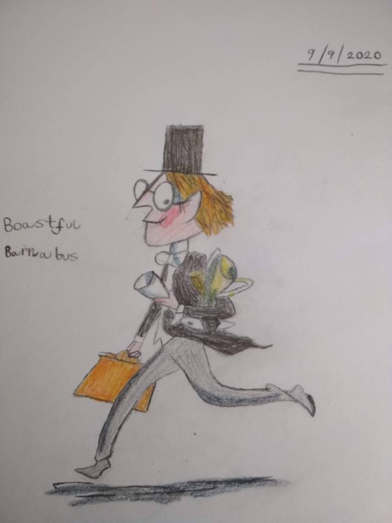 On 29 April 2020, I began drawing a frog-jar hybrid named Dylan Jarmen. The picture was finished on 8 May 2020. I based Dylan on a jar in the British Museum, and his name comes from the fact that he was inspired by the jar. Dylan hails from Texas, is coloured blue and has big feet with yellow toenails and a kangaroo-like tail, and he wears a brown Ash Ketchum-like hat with a green spiral and a yellow star on it and a red Yogi Bear-like necktie. Living inside Dylan is a grumpy, purple gopher named Grumper.